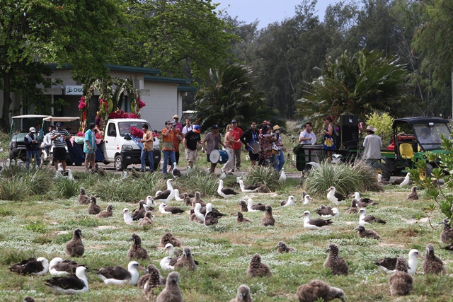 Back to Midway. Here's a Laysan albatross preening one of the young Short-tailed albatross that has been coming showing up recently.